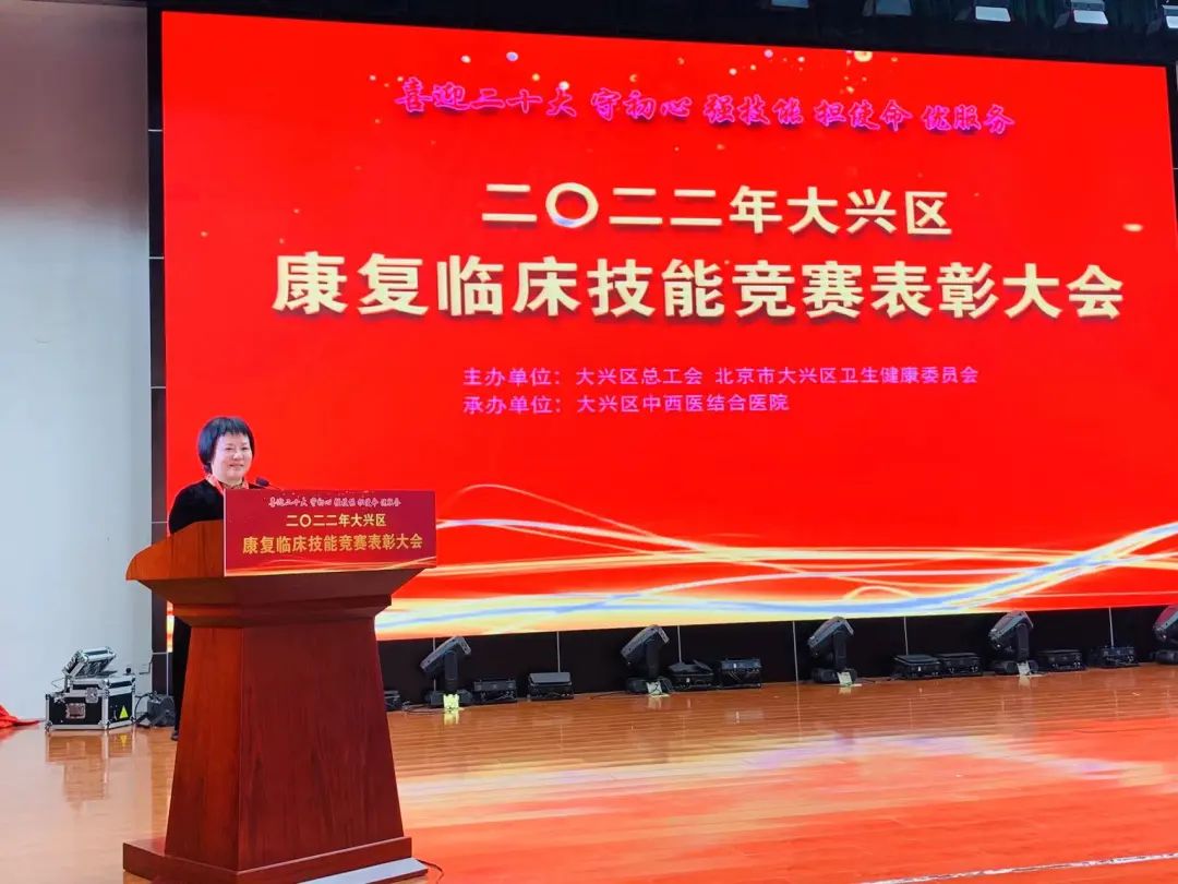 最后,区卫健委副主任张颖在讲话中对获奖的个人和团体表示祝贺,并对参与此次大赛的各方和组织工作表示感谢。希望大家总结经验,加强学习,共同提高,以此次比赛为契机,加快推进大兴区康复医疗队伍的专业化、规范化,不断提升专业技术水平和职业素养,打造一支技术过硬,品行皆有的医疗队伍,为辖区百姓提供更好的康复医疗服务。
