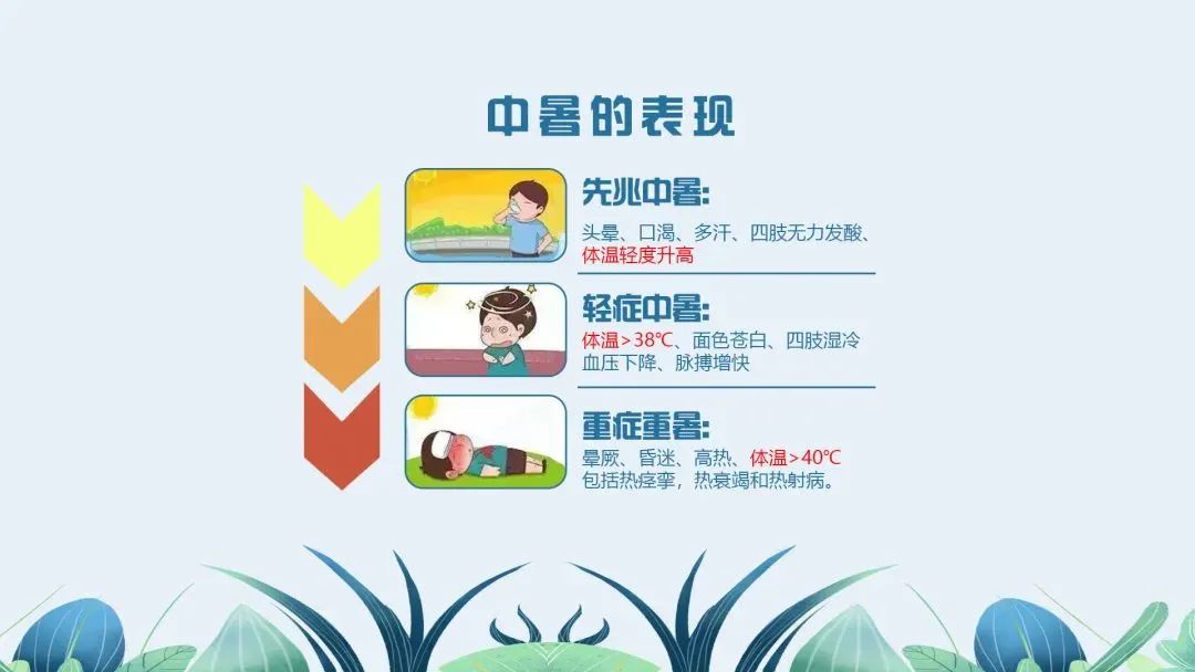 ● 轻度中暑:除有先兆中暑症状,同时表现为体温>38.5℃,伴有面色潮红、胸闷、皮肤灼热、面色苍白、恶心、呕吐、大量出汗、皮肤湿冷、血压下降和脉搏细弱而快等。