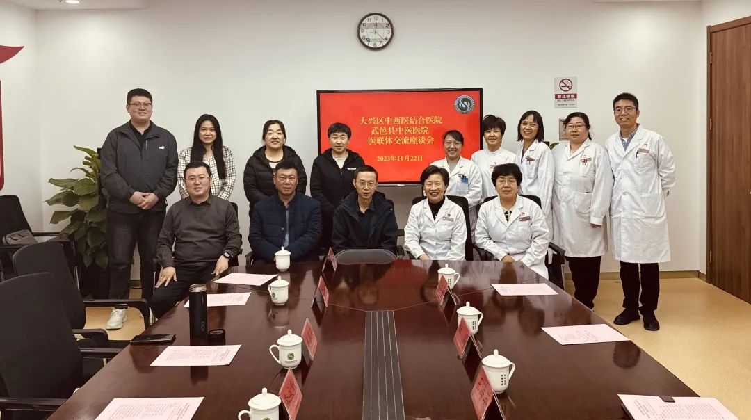 本次交流,衡水武邑县卫健局副局长李永红,武邑县中医医院院长支振东、副院长何明浩及相关科室主任参会,大兴区中西医结合医院院长王海英,副院长宋炜及相关处室主任出席,会议由师闯副院长主持。