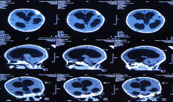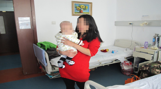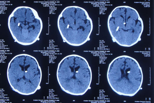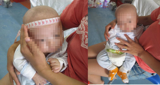 患儿3月龄时入我院,神智清楚,精神可,体温不高,双眼下视(落日征)明显,囟门彭隆,头围增大至41cm,CT:脑积水。