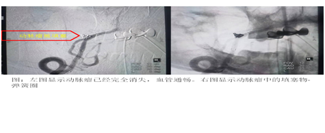动脉瘤并非是实心的肿瘤,是血管弹性的下降,是在血压的冲击下导致局部血管壁的凸出彭起,凸起的顶端壁是最薄弱的,也是这次发病的出血点。微创介入的方法就是从血管途径进入凸起的囊,采用柔性的弹簧圈,将动脉瘤囊致密填充,完全封堵破口。过程是紧张的,手术还是很顺利,完全闭塞了动脉瘤,椎动脉通畅(见下图)