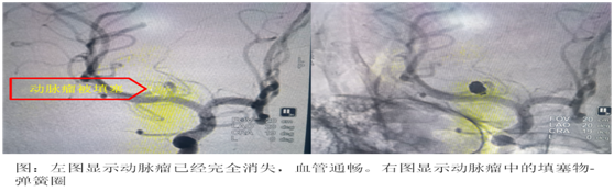 患者很年轻,我们尽快安排了介入手术,脑血管造影结果明确了出血的原因,右侧大脑中动脉瘤。