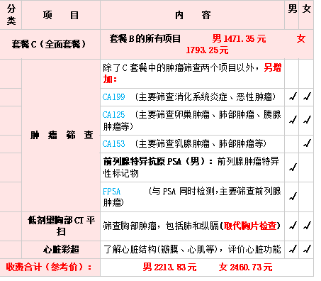 C套餐是一款全面的、多系统的的检查,增加了多项肿瘤的筛查。